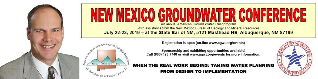 The American Ground Water Trust (AGWT) Annual New Mexico Groundwater Conference will be held in Albuquerque, New Mexico on July 22-23, 2019, with assistance from the New Mexico Bureau of Geology and Mineral Resources. The conference theme is “When the Real Work Begins: Taking Water Planning from Design to Implementation.”