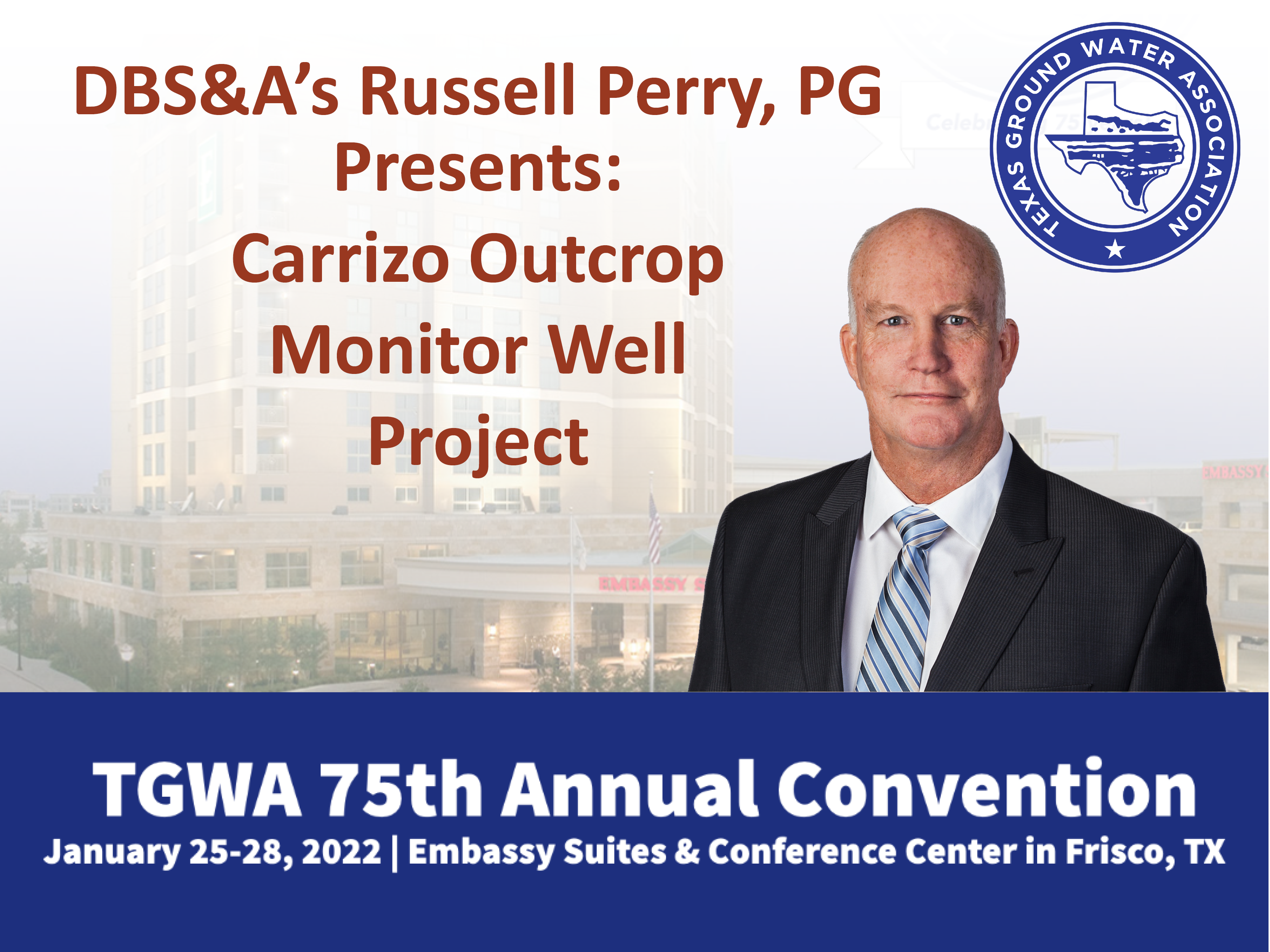 The 2022 Texas Ground Water Association (TGWA) Annual Convention is taking place from January 25 to January 28, 2022 at the Embassy Suites Hotel & Conference Center in Frisco, Texas. This year, the convention also includes celebrating TGWA’s 75th anniversary. DBS&A Geologist Russell Perry, PG, is presenting on DBS&A’s recent monitor well installation work in the Carrizo Formation.